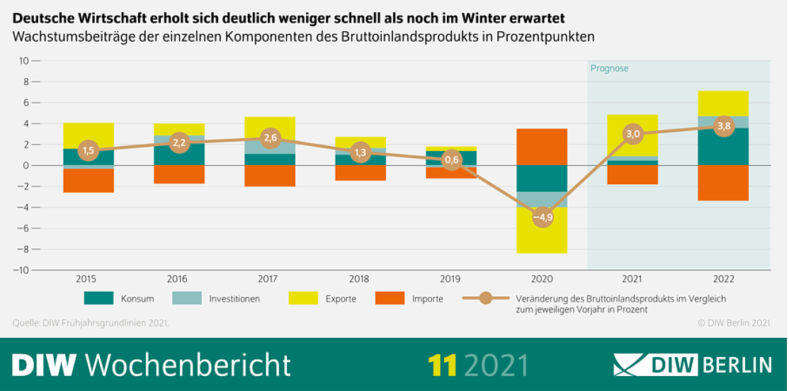 Die deutsche Wirtschaft profitiert derzeit von Impulsen aus der übrigen Welt. Den DIW-KonjunkturforscherInnen zufolge wäre es aber ein großer Fehler, sich darauf zu verlassen und auszuruhen. Zumal wichtige Modernisierungsvorhaben, beispielsweise bei der Digitalisierung, Verkehrsinfrastruktur, Bildung und beim Klimaschutz, andernorts schneller vorangebracht werden als hierzulande. Deutschland droht zurückzufallen; mehr und zügig realisierbare Zukunftsinvestitionen sind dringend gefragt. Zwar sind die öffentlichen Haushalte infolge der Krisenbekämpfungsmaßnahmen nicht mehr auf Rosen gebettet – so dürfte die Schuldenstandsquote in diesem Jahr auf 71 Prozent steigen. Dennoch gibt es Spielräume, zumal sich die Zinsen nach wie vor im negativen Bereich bewegen, der deutsche Fiskus an der Schuldenaufnahme also sogar noch verdient. Modellschätzungen des DIW Berlin zeigen, dass jeder zusätzliche Euro an öffentlichen Investitionen etwa 1,60 Euro zusätzliches Bruttoinlandsprodukt mit sich bringt. Das daraus resultierende zusätzliche Wachstum der deutschen Wirtschaft würde mittelfristig auch dazu beitragen, die öffentliche Verschuldung wieder zu reduzieren.