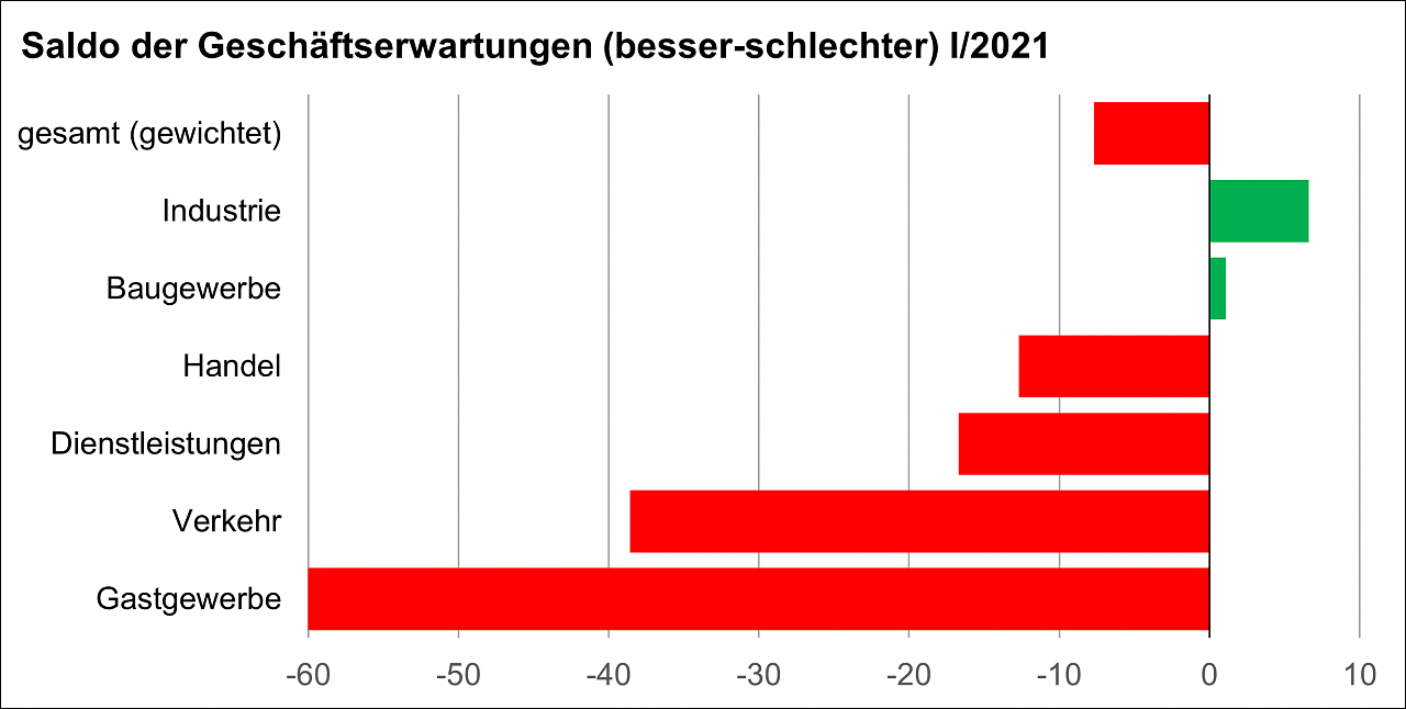 Der Handel meldet einen schwachen Jahresstart, insbesondere die Lagebewertung trübt ein. Hier schlagen sich weiter ausbleibende Lockerungen nieder: Das Geschäftsklima ist fast unverändert mit -3,0 Punkten negativ ohne Hoffnung auf eine Erholung wie 2020. Die Geschäftslage wird schwächer bewertet als vor einem Jahr. Die Erwartungen verbessern sich zwar aktuell, aber noch immer überwiegen die pessimistischen Stimmen.