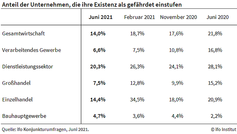 Im Juni fürchtete das knapp jedes siebte Unternehmen (14,0 Prozent), nach 18,7 Prozent im Februar. Immer noch besonders gefährdet sind die Unternehmen der Veranstaltungsbranche mit 70,4 Prozent, vor den Reisebüros und -veranstaltern mit 68,0 Prozent, sagt Klaus Wohlrabe, Leiter der ifo Umfragen.