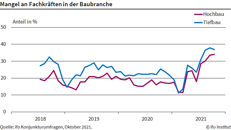 Der Fachkräftemangel im Hochbau hat sich verstärkt. Das geht aus einer Umfrage des ifo Instituts hervor. In der Branche meldeten im Oktober 34,1 Prozent der Unternehmen einen Mangel an Fachkräften, nach 33,5 Prozent im Vormonat...