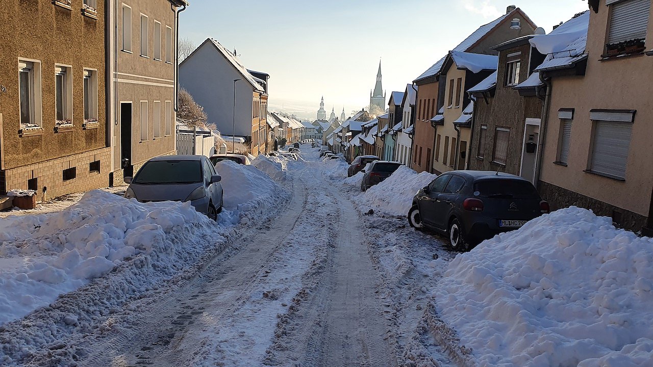 Wandern unter erschwerten Bedingungen: Geschlossene Gaststätten und Frost bis -22 Grad. Beim 38. Südharz-Hunderter erreichten Bodo Schwarzberg und Lutz Hollerbuhl nach überstandener eisiger Nacht am Morgen des 14. Februar 2021 die tief verschneite Lutherstadt Eisleben. (Foto: B.Schwarzberg)