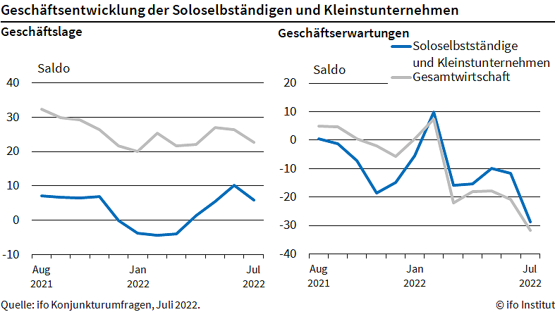 Die positive Entwicklung seit März 2022 hat ein abruptes Ende gefunden: Der Indikator fiel auf den niedrigsten Stand seit Einführung der Umfrage unter Soloselbständigen und Kleinstunternehmen im August 2021. Die Unternehmen waren weniger zufrieden mit ihren laufenden Geschäften. Am besten stehen noch die Dienstleister da, mit 17,7 Punkten, nach 23,6 im Juni. Viele Einzelhändler leiden unter der hohen Inflation. Die Erwartungen sind eingebrochen und von deutlichem Pessimismus geprägt.