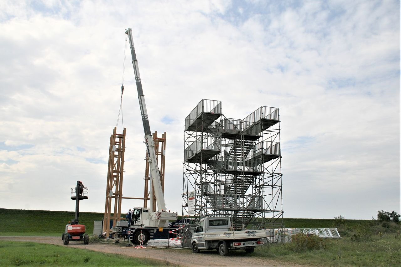 Seit ein paar Tagen baut die Firma Scharf Holzbauwelt den neuen Beobachtungsturm in Berga auf. Errichtet wird das Bauwerk aus vorgefertigten Nagelplattenbindern...