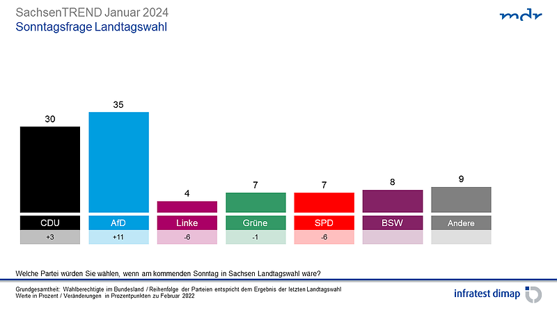 Am 1. September findet in Sachsen die nächste Landtagswahl statt. Gut acht Monate vor dem Urnengang ist die AfD in der aktuellen landespolitischen Stimmung mit 35 Prozent die derzeit stärkste politische Kraft...
