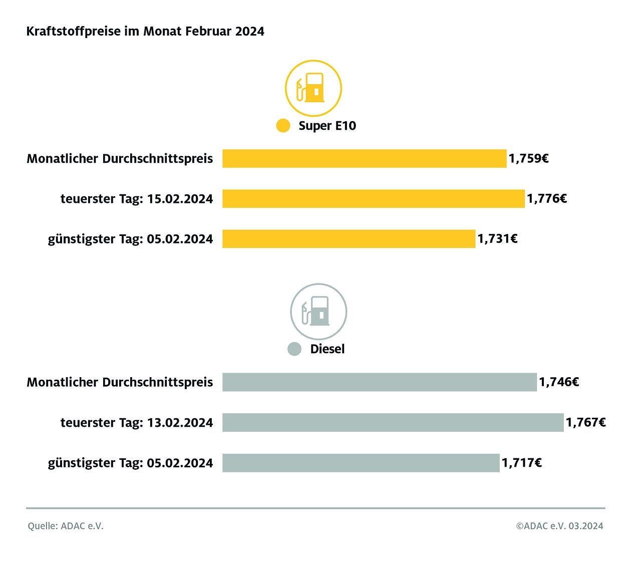 Am teuersten war Super E10 am 15. Februar mit 1,776 Euro je Liter. Günstigster Tag für E10 war der 5. Februar mit durchschnittlich 1,731 Euro. Der Dieselpreis war am 13. Februar mit 1,767 Euro am höchsten. Billigster Tag war ebenfalls der 5. Februar mit 1,717 Euro. In die Phase des Spritpreisanstiegs fiel auch die Verteuerung beim Rohöl. Während ein Barrel der Sorte Brent noch am 5. Februar weniger als 78 US-Dollar kostete, lag der Preis nur zehn Tage später etwa fünf US-Dollar höher.
