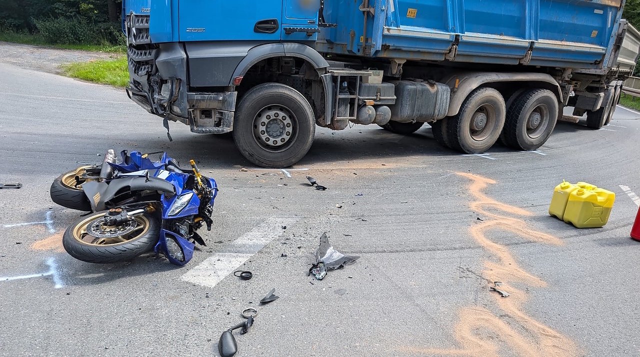 Auf Höhe der Zufahrt zu einem Firmengelände an einem Steinbruch kollidierte gegen 14.30 Uhr aus noch ungeklärter Ursache ein Motorradfahrer mit einem Lkw. Der Fahrer des Kraftrades zog sich hierbei lebensbedrohliche Verletzungen zu.