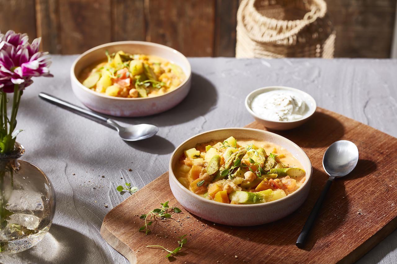 Spargel und Kartoffeln schmecken jedoch nicht nur ganz klassisch mit Schinken und Sauce Hollandaise, sondern zum Beispiel auch als cremiges Ragout. Gemeinsam mit Möhren, Tomaten, Zwiebeln und Knoblauch erhält das Gericht eine Extraportion an gesunden Nährstoffen und eine würzige Note. Kichererbsen sorgen darüber hinaus für eine leicht cremige Konsistenz und eine dezente, nussige Süße. Gleichzeitig liefern sie hochwertiges pflanzliches Eiweiß und Ballaststoffe, die die Verdauung fördern und lange satt machen.