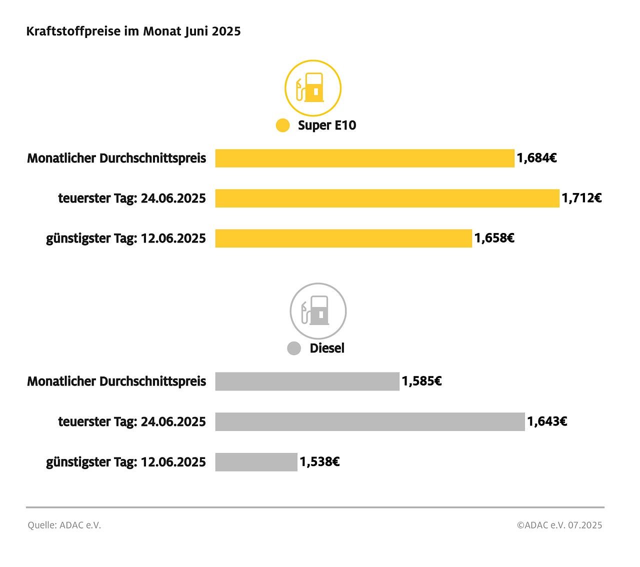 Teuerster Tag zum Tanken war der 24. Juni. Ein Liter Super E10 kostete 1,712 Euro, der günstigste Tag des Monats und auch des laufenden Jahres war der 12. Juni mit einem Durchschnittspreis von 1,658 Euro. Diesel hatte ebenfalls am 24. Juni sein Monatshoch erreicht mit einem Tagesdurchschnittspreis von 1,643 Euro. Wie bei Benzin fiel der Tiefstpreis des Monats ebenfalls auf den 12. Juni mit 1,538 Euro. Deutlich wird dabei, dass Diesel sich im selben Zeitraum fast doppelt so stark verteuert hat wie Benzin.