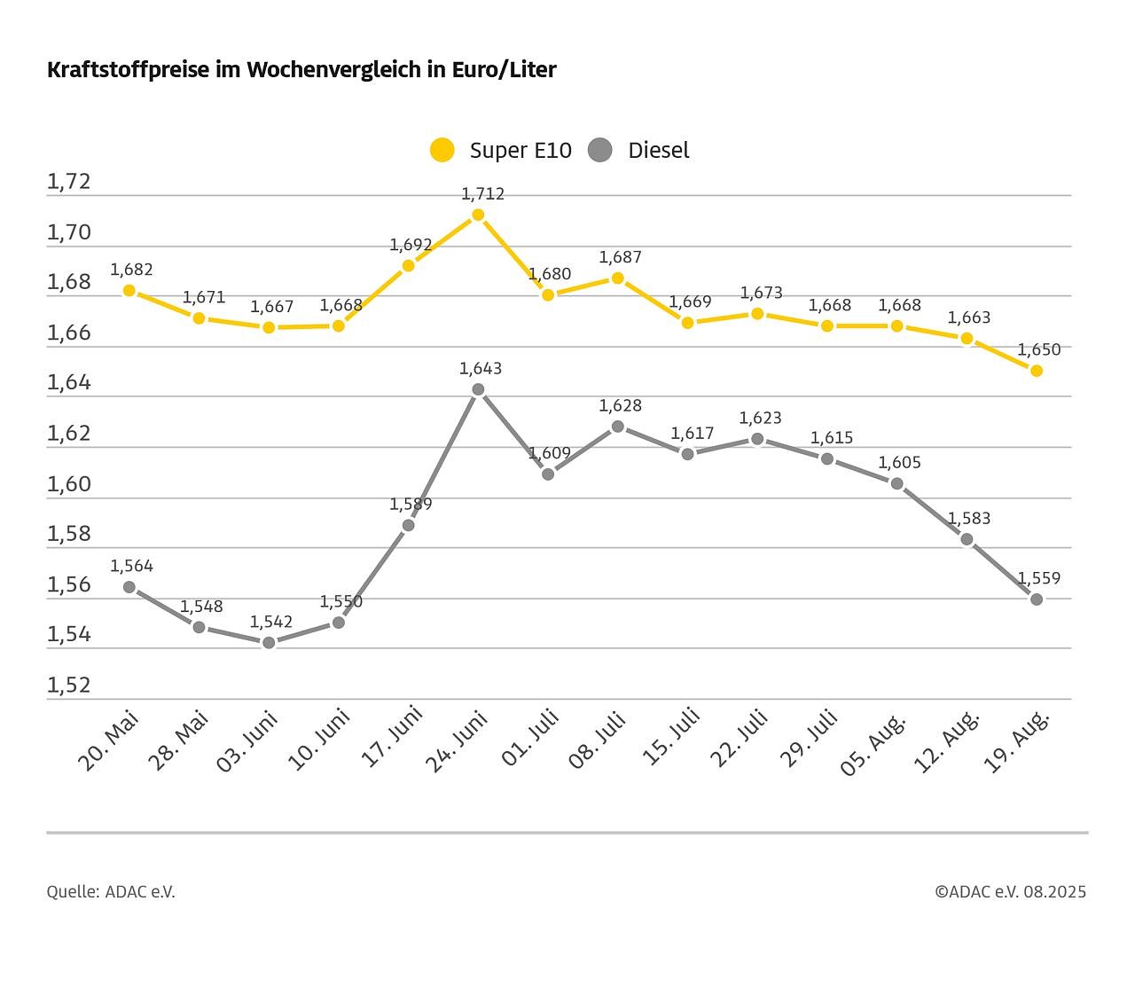 Die aktuelle ADAC Auswertung der Kraftstoffpreise in Deutschland zeigt, dass der Preis für einen Liter Super E10 binnen Wochenfrist um 1,3 Cent zurückgegangen ist und jetzt bei durchschnittlich 1,650 Euro liegt. Diesel hat sich sogar um 2,4 Cent verbilligt und kostet aktuell 1,559 Euro.