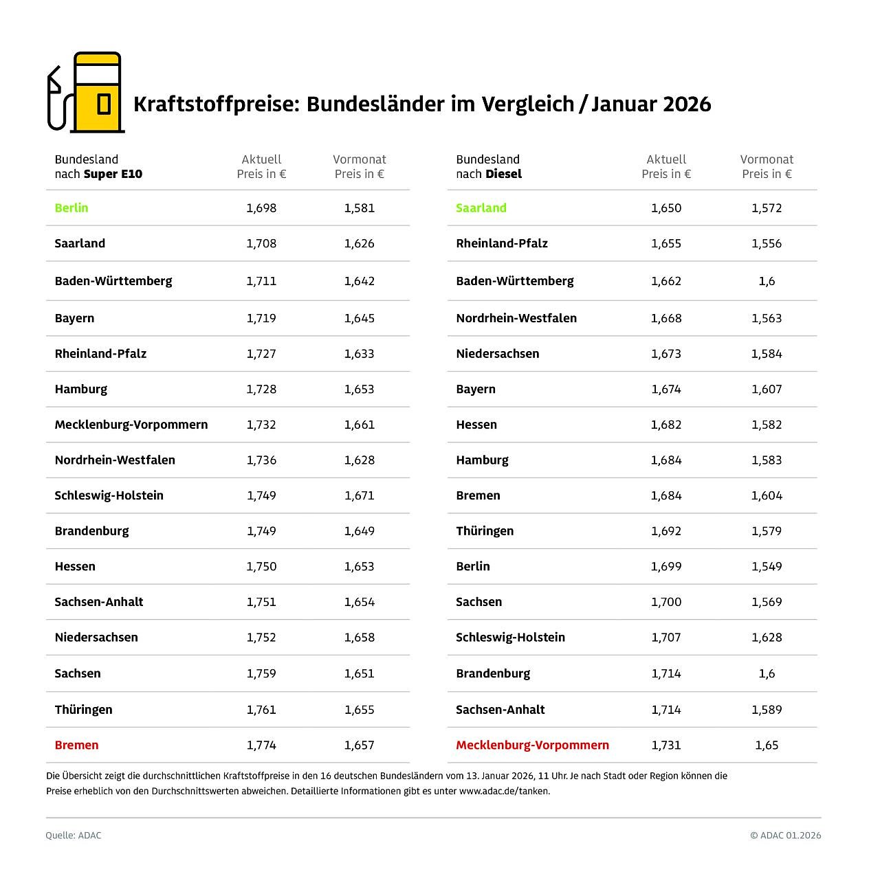 Für die heutige Untersuchung hat der ADAC die Preisdaten von mehr als 14.000 bei der Markttransparenzstelle für Kraftstoffe erfassten Tankstellen ausgewertet und den 16 Bundesländern zugeordnet. Die ermittelten Preise stellen eine Momentaufnahme vom 13. Januar 2026, 11 Uhr, dar.