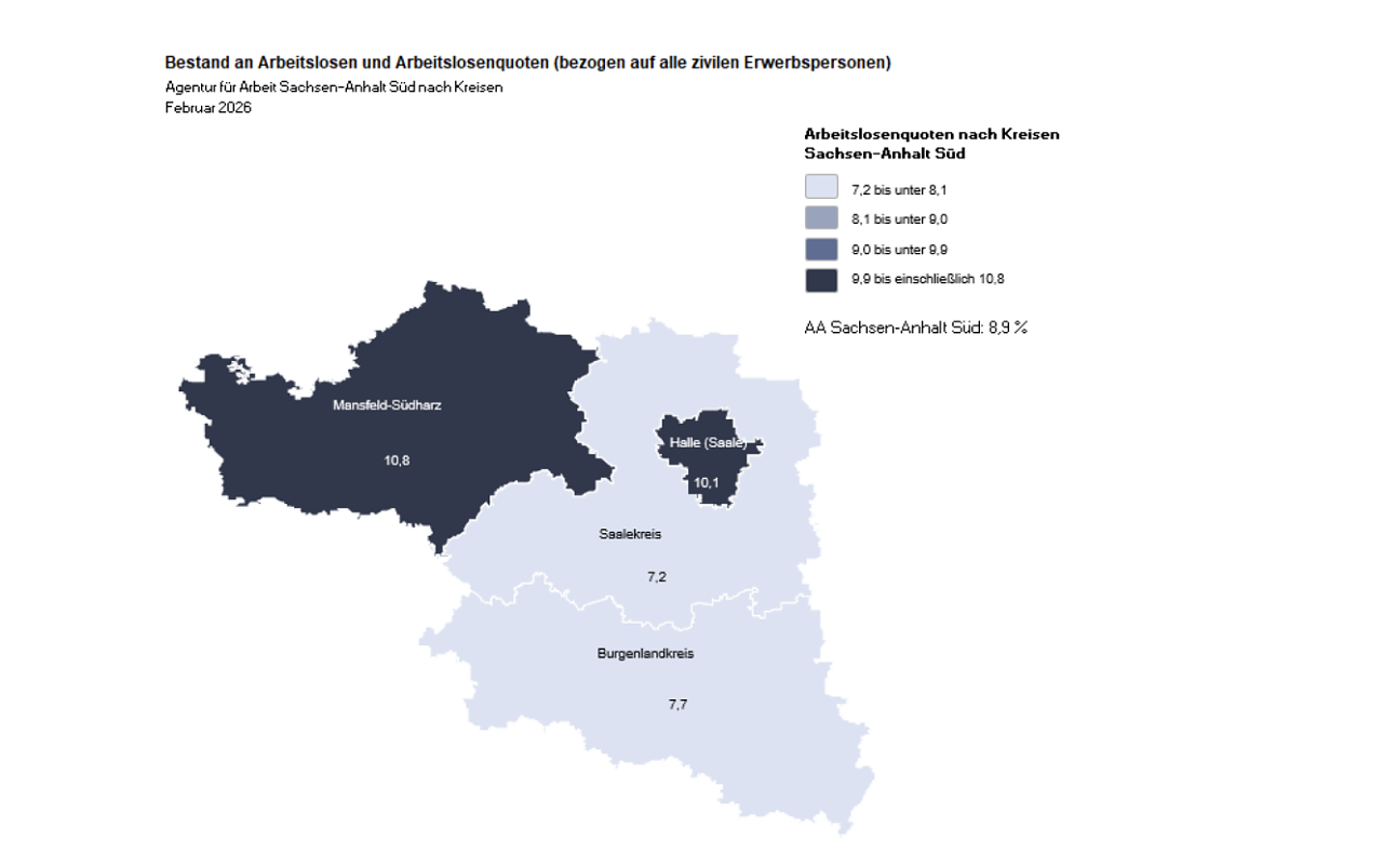 Im Februar waren 6.803 Frauen und Männer in Mansfeld-Südharz von Arbeitslosigkeit betroffen. Damit ist die Zahl Arbeitslosen um 124 Personen zum Vormonat gesunken. Im Vergleich zum Vorjahr sind gegenwärtig