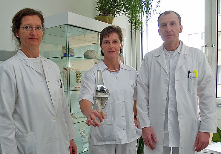 Autor: nnzFachärztin für Orthopädie, Dr. med. Christine Knauer, mit Modell eines Kniegelenks, rechts daneben der Chef des Zentrums für Rehabilitation und Physiotherapie, Dr. Andreas Wagner, links Oberärztin in der Klinik für Unfallchirurgie und Orthopädische Chirurgie, Dr. med. Wiltrud Schröder