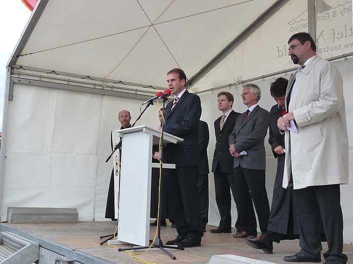 Als erster Redner vor bestimmt ca. 200 Gästen aus der Region verwies der Amtsleiter des Nordthüringerstraßenbauamts, Franz Rohmund, auf die gute Arbeit, welche die Firmen beim Bau der Ortsumgehung geleistet hatten. Dabei nannte er die Arbeitsgemeinschaft Bickhardtbau und Kirchner, aber auch auf Firmen der Region, wie z.B. Schachtbau und Kemna aus Nordhausen oder Bach und Reinhardt sowie die Glückauf Vermessung aus Sondershausen.