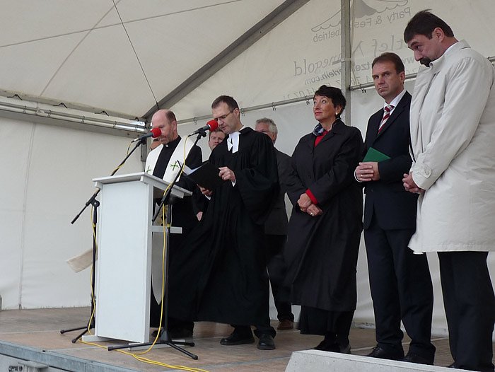 In einem gemeinsamen Gebet erbaten die Pfarrer Günther Albrecht (kath.) und Christoph Behr (ev.) den Segen für die neue Ortsumgehung.