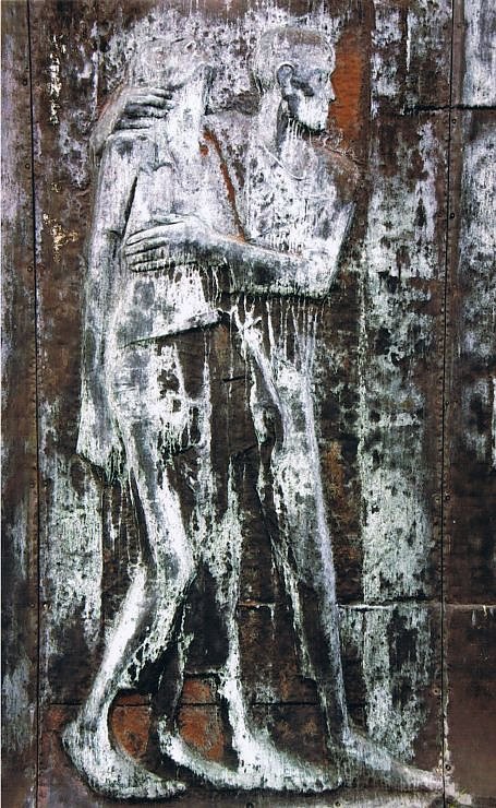 Eine der Dreiergruppen wirkt wie eine Predella mittelalterlicher Altarbilder. Die drei auch im Tode durch ihre Qualen Gekennzeichneten werden in der Erinnerung überleben. Eine Zweiergruppe zeigt die Hilfsbereitschaft untereinander, die an die berühmte antike Skulpturengruppe der Dioskuren Castor und Pollux denken lässt, deren zahlreiche Kopien aufzeigen, für wie wichtig das Freundschaftsmotiv in unserer Kulturgeschichte gehalten wird. Bei Scharr hilft der sich besser Fühlende dem Schwächeren, dessen Gesicht zur Weite des Himmels erhoben ist. Stützend und schützend legt der Helfende seine Hände um den anderen, dabei auf den Weg achtend.