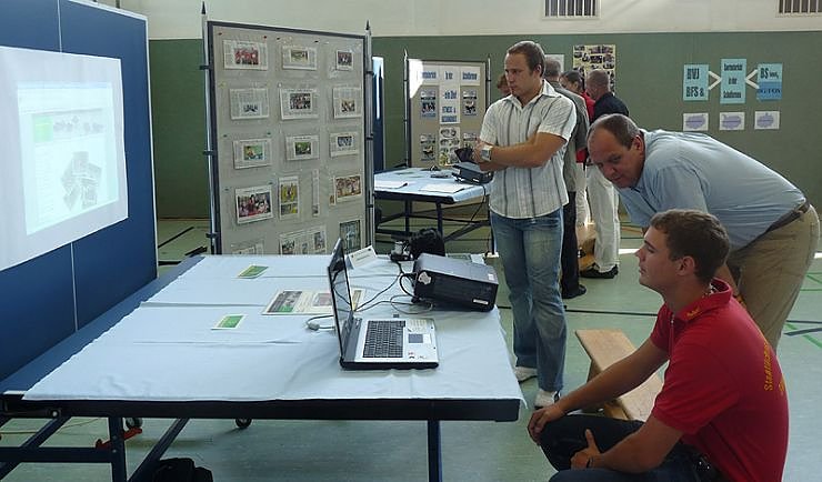 Jörg Hoffmann (gebückt), gebürtiger Sondershäuser, informiert sich bei der Präsentation.