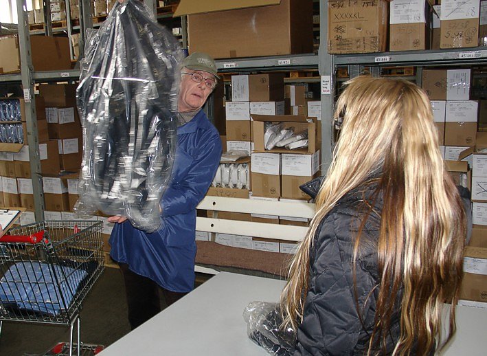Mit der aktuellen Größenliste ging es dann zur Ausgabe. Flink suchten die Mitarbeiter und Mitarbeiterinnen alle Uniformbestandteile aus den meterhohen Regalen zusammen und übergaben sie an die Beamten.