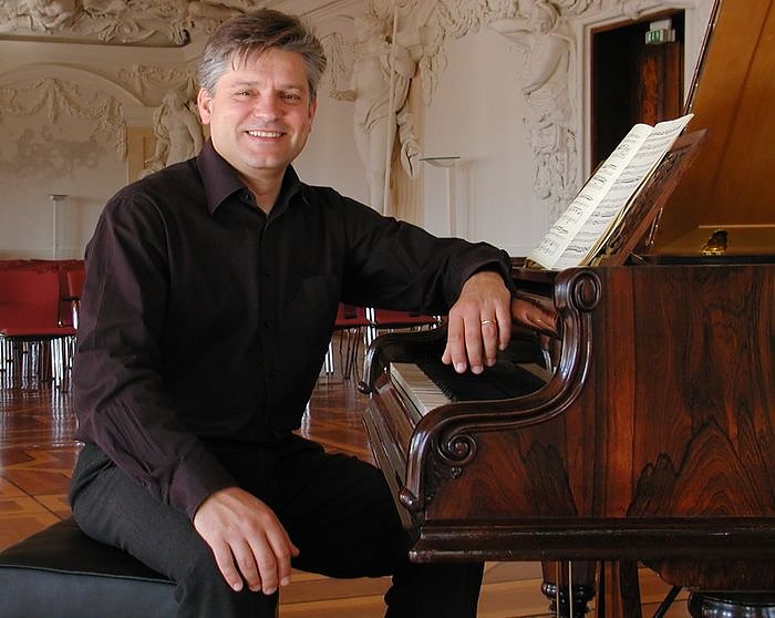 Markus Frank (Foto) ist fasziniert von dem Klang und der Anschlagstechnik dieses alten Instruments. Auf ihm spielt er gemeinsam mit Marek Adam Smentek und Matthias Weicker das berühmte Zigeunertrio von Joseph Haydn (Klaviertrio Nr. 39 G-Dur Hob. XV:25) sowie als heiteres Schlussstück des Vormittags ein Potpourri aus Johann Strauß Operette Der Zigeunerbaron. Hier ist dann die volle Besetzung aus acht Musikern zu erleben.