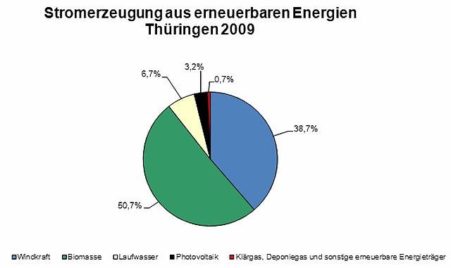 In Thüringen wurden im Jahr 2009 rund 2,9 Milliarden Kilowattstunden (kWh) Strom aus erneuerbaren Energien erzeugt. Nach Mitteilung des Thüringer Landesamtes für Statistik waren es 135 Millionen Kilowattstunden bzw. 5,0 Prozent mehr als im Jahr zuvor. Mit der erzeugten Strommenge könnten 1,07 Millionen der 1,13 Millionen Thüringer Haushalte ein Jahr lang versorgt werden.