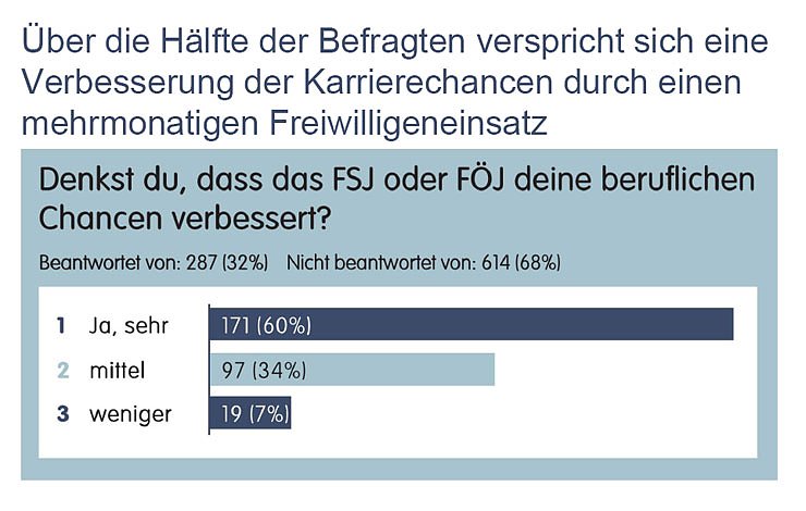 Die meisten Befragten machen positive Erfahrungen im Rahmen ihrer freiwilligen Tätigkeit: 68 Prozent sind sehr zufrieden, 72 Prozent wollen sich beispielsweise nach ihrem FSJ weiterhin engagieren und 94 Prozent empfehlen auch anderen, sich zu engagieren.Mehr als die Hälfte (53 Prozent) der befragten Jugendlichen jedoch gaben an, nur teilweise Anerkennung für ihre Tätigkeit zu bekommen. 8 Prozent erfahren keine Anerkennung, obwohl es für eine große Mehrheit (84 Prozent) sehr wichtig ist.
