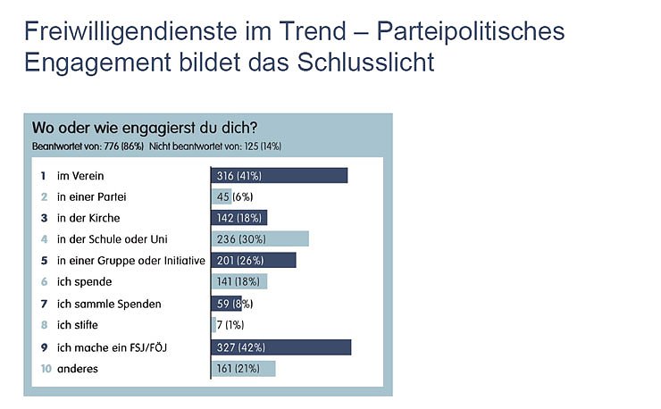 42 Prozent der teilnehmenden Jugendlichen absolvieren zum Zeitpunkt der Befragung ein Freiwilliges Soziales Jahr oder ein Freiwilliges Ökologisches Jahr. Fast ebenso viele sind in Vereinen aktiv (41 Prozent). An Schulen und Universitäten engagieren sich 30 Prozent der Befragten, in Kirchen 18 Prozent. Nur 6 Prozent der Befragten engagieren sich in politischen Parteien.Nicht immer ausreichend Anerkennung