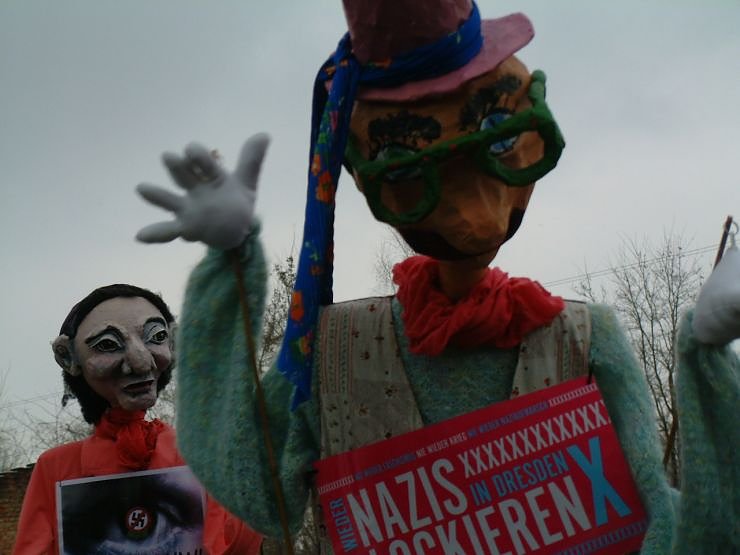In Richtung Bahnhof sowie im Süden und an der angrenzenden Unterführung im Norden hat die Polizei Stellung bezogen. Seit dem frühen Mittag harren die Menschen hier aus und weigern sich den Platz zu räumen. Auch der Jenaer Oberbürgermeister, Albrecht Schröter (SPD), einer der bekanntesten Gegner der extremen Rechten, befindet sich auf der Blockade. Neun Busse sind allein aus seiner Stadt angereist. Tags zuvor hatte er gegenüber der Online Ausgabe des Spiegel erklärt: Straßenblockaden gegen Neonazis mögen nicht legal sein, aber sie sind legitim. Es ist ein Dilemma, dass die Mittel des Rechtsstaats gegen rechte Aufmärsche begrenzt sind. Aber Politiker und Bürger sollten alles tun, um den Neonazis keinen Raum zu geben. Dazu gehört auch ziviler Ungehorsam.