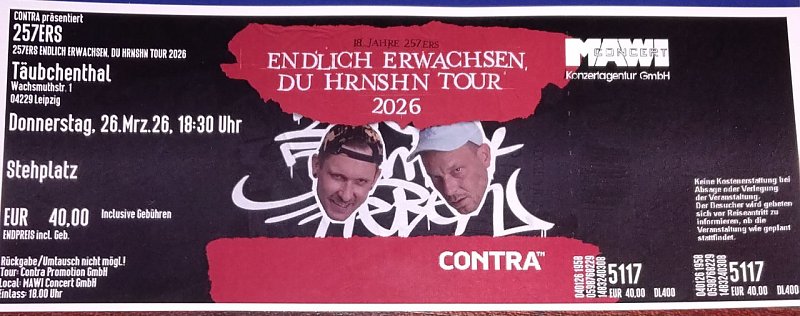 Gebe aus gesundheitlichen Gründen eine konzertkarte ab ENDLICH ERWACHSEN DU HRNSHN TOUR 2026