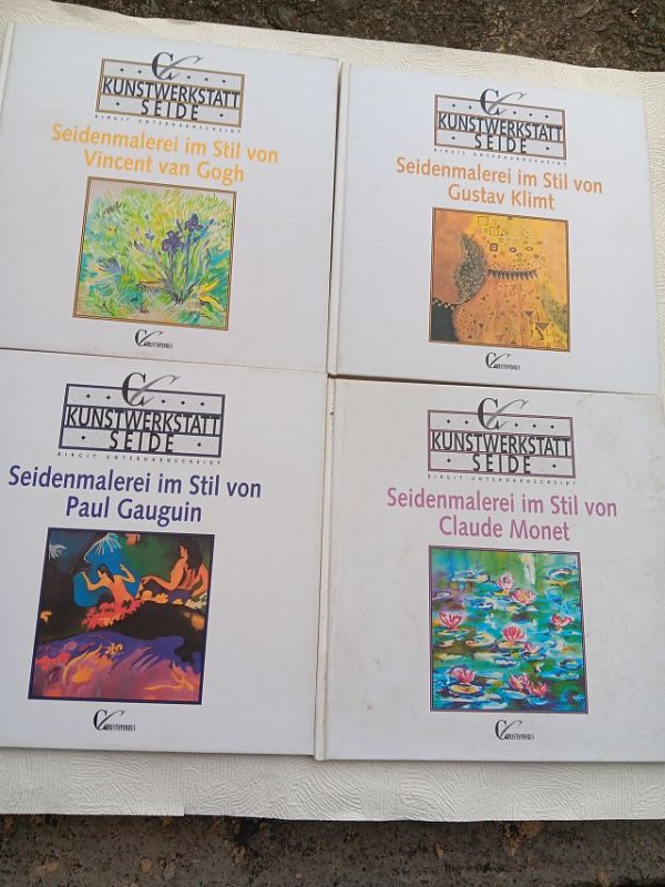 verkaufe 4 gut erhaltene Bücher zur Seidenmalerei im Stiel von van Gogh , Paul Gaguin, Gustav Klimt und Claude Monet , gebraucht , aber gut erhalten ca. 64 Seiten in jedem Buch