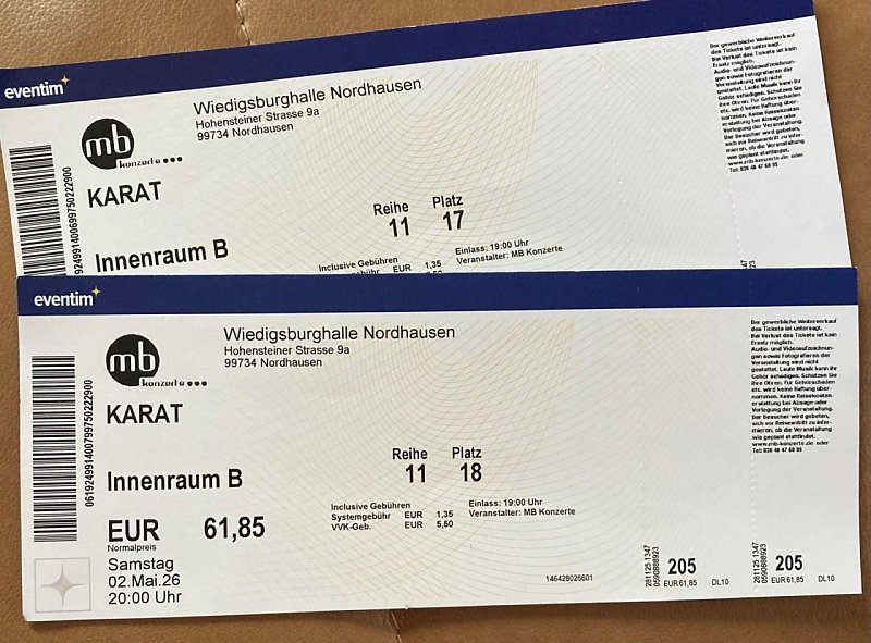 2 Karten für Karat Konzert in Nordhausen am 02.05. in der Wiedigsburg Halle, Sitzplätze, 50 € pro KarteVersand, Abholung ...