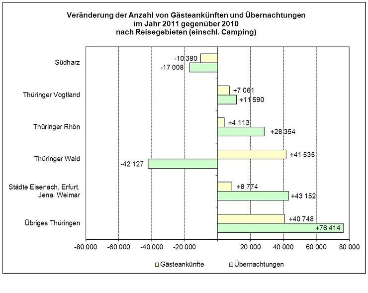 Vier der sechs Thüringer Reisegebiete konnten im Jahr 2011 sowohl steigende Übernachtungszahlen verbuchen als auch mehr Gäste begrüßen. Deutliche Zuwächse verzeichneten das Thüringer Vogtland (Übernachtungen: +3,3 Prozent, Gästeankünfte: +3,9 Prozent) und die Thüringer Rhön (Übernachtungen: +6,4 Prozent, Gästeankünfte: +3,4 Prozent). Auch das Reisegebiet der Städte konnte gegenüber 2010 zulegen. Allerdings war die positive Entwicklung hier auf Zuwächse in den Städten Jena und Weimar zurückzuführen. Die Städte Erfurt und Eisenach hatten bei rückläufigen Gästezahlen (-1,9 bzw. -2,0 Prozent) Übernachtungszahlen auf dem Niveau von 2010 zu verbuchen.