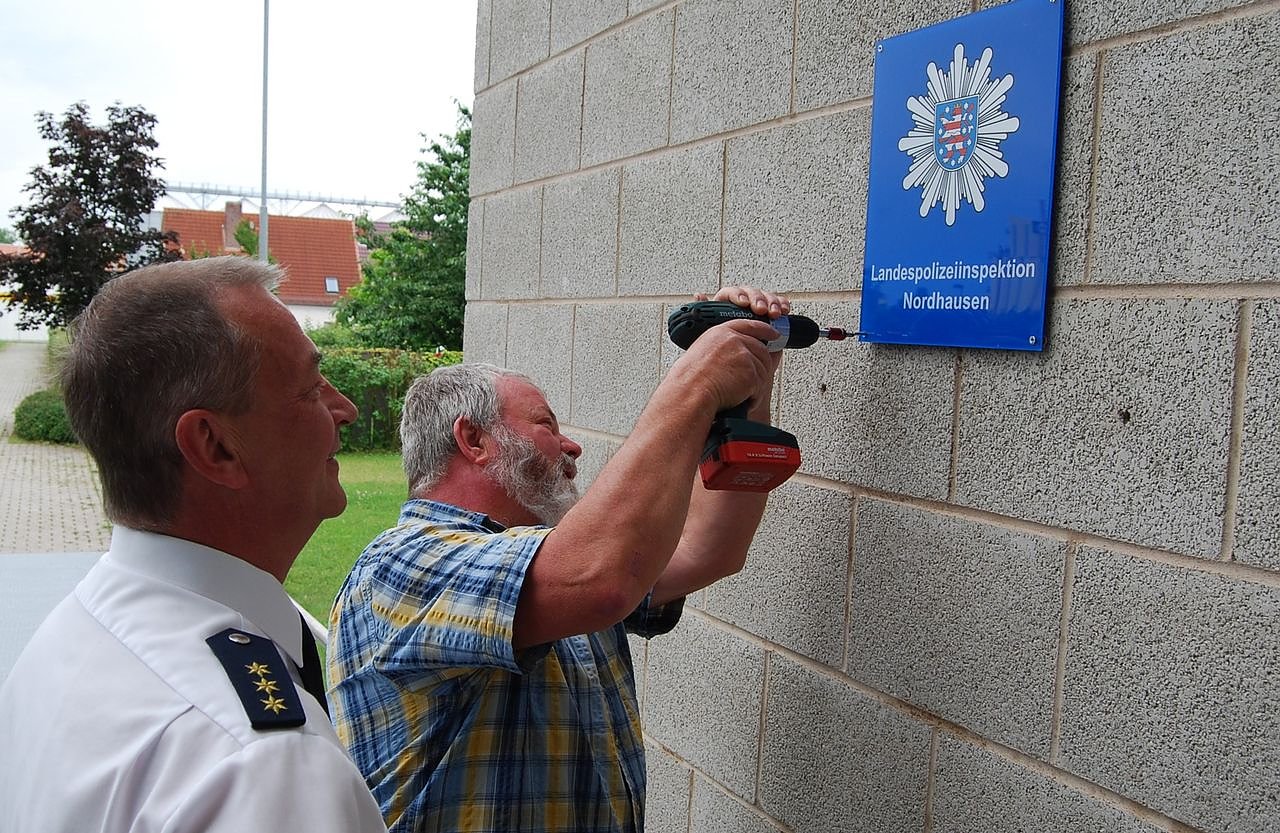 Autor: nnzAm Vormittag: Polizeidirektor Thomas Unger bringt mit dem Hausmeister Manfred Batke das neue Dienststellenschild an.