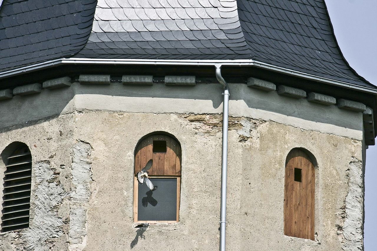 Turmfalke, Dohlen oder Schleiereulen nutzen Kirchtürme gerne als Ersatz für natürliche Bruthöhlen in Felsen oder Bäumen. Auch Fledermäuse finden oft geeigneten Unterschlupf unter dem Dach der Kirche oder des Kirchturms.