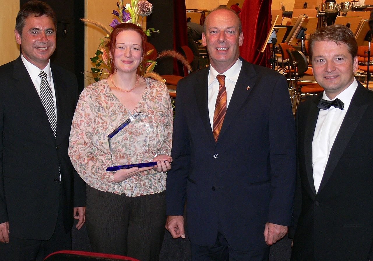 2011 erhielt Bianca Sue Henne den Nordhäuser Theaterpreis. V. li. Wolfgang Asche (Kreissparkasse Nordhausen), Bianca Sue Henne, Landrat Joachim Claus, Intendant Lars Tietje. Foto: Birgit Susemihl