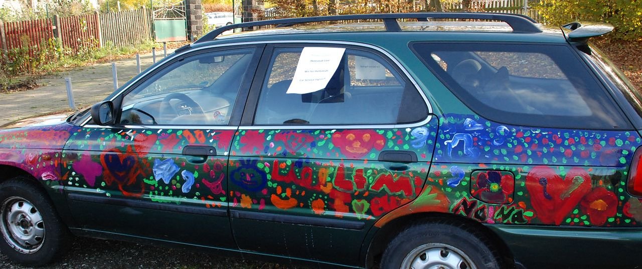 Das Auto wurde also doch bemalt? Ja, es hat den TÜV bekommen, und André hat Wort gehalten, freut sich Frau Dietrich. Die Kinder seien begeistert, aber auch absolut diszipliniert gewesen beim Umgang mit der Acrylfarbe, die anschließend noch eine professionelle Klarlackversiegelung erhalten hat. Große Hingabe, keine Rangelei, viel Geduld, wenn jemand noch nicht so schnell fertig war – offensichtlich waren sich alle der ungewöhnlichen Aufgabe bewusst.
