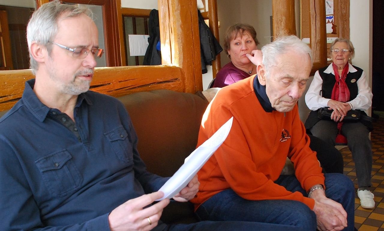 Während der Gespräche über die Bombenabwürfe auf Dresden im Februar 1945. Dr. Albrecht Börner liest aus den Erinnerungen seiner Mutter (links). Neben ihm sitzt Siegfried Fuchs, der ebenfalls über seine Erlebnisse in der bombardierten Stadt berichtete. (Foto: Jochen Miche)