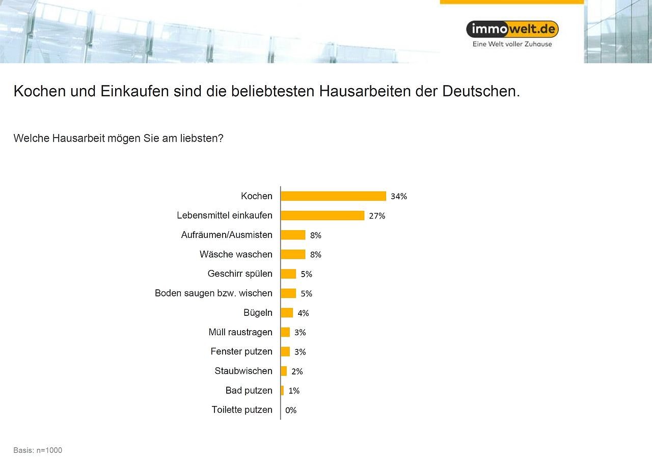Übereinstimmung herrscht auch bei der Lieblings-Aufgabe der Deutschen im Haushalt, dem Kochen: Für 36 Prozent der Frauen und 32 Prozent der Männer ist der Platz am Herd das Haushalts-Highlight. Auf Platz 2 rangieren die Vorbereitungen: Allerdings gehen die Männer (31 Prozent) deutlich lieber Lebensmittel einkaufen als die Frauen (22 Prozent).