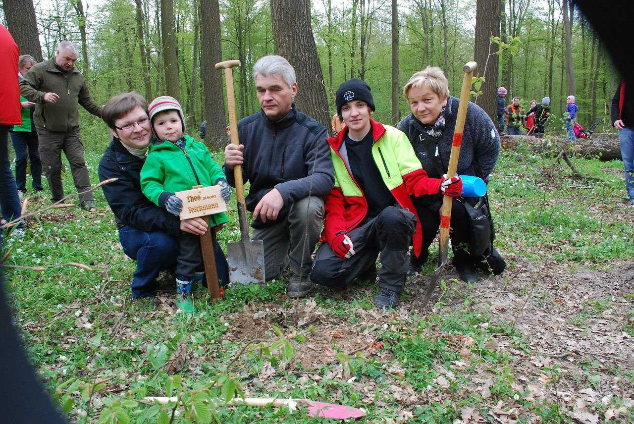 Unterstützt wurden die Kinder, die hier ihren eigenen Baum setzen konnten, von ihren Eltern, Geschwistern und anderen Verwandten, aber auch von Freunden und Persönlichkeiten des öffentlichen Lebens. Zum Beispiel war Rothenschirmbachs Ortsbürgermeister Jürgen Grobe da, der mit Blick auf die vielen gut gelaunten Menschen und auf den schönen Laubwald im Brustton tiefster Überzeugung meinte: Das ist wirklich eine sehr gute Aktion. Seine Amtskollegin, Eislebens Oberbürgermeisterin Jutta Fischer, pflanzte ebenfalls einen Baum, der das Schild Für die Kinder der Lutherstadt Eisleben erhalten wird. Frau Fischer als Botschafterin eines der Zukunft zugewandten Eislebens und Bewahrerin der Lutherschen Tradition, denn der in Eisleben geborene und gestorbene Martin Luther hatte einmal den unvergesslichen Satz geprägt: Wenn morgen die Welt unterginge, pflanzte ich noch ein Apfelbäumchen.