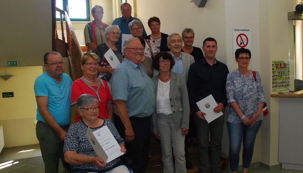 An diesem Erfolg haben laut Schneegaß viele Menschen einen Anteil. Neben anderen würdigte er die Mitarbeiter der Kreisverwaltung, aber auch die Mitwirkenden. Hier dankte er insbesondere dem OB a.D. Fritz-Dieter Kupfernagel. Der frühere Sangerhäuser Oberbürgermeister brillierte in der Benefizgala als Sänger sowie mit seinem schauspielerischen Talent und Humor. Auch er war heute gekommen, um den Vertretern der Selbsthilfegruppen zu den Spenden zu gratulieren. Ihm wie überhaupt den Künstlern und Mitgestaltern der Benefizgala galt ein Kompliment, das der Leiter der Eisleber Diabetiker-Selbsthilfegruppe, Ulrich Bennemann, sagte: Das war eine wirklich großartige Veranstaltung. Sie hat jedem etwas geboten. Ich weiß genau, dass ich zur nächsten Benefizgala auch dann gehen werde, wenn andere Selbsthilfegruppen eine Spende bekommen. Auch er dankte den Organisatoren und Akteuren und blieb nicht allein mit dem Bedauern, dass der Veranstaltungsort, der Ludowingersaal der Kreismusikschule Carl Christian Agthe in Sangerhausen, bei der Gala nicht bis auf den letzten Platz besetzt gewesen war. Dennoch überwog heute die Freude über die Spenden, und sie erhielt noch weiteren Anschub beim fröhlichen Gedränge während des Familienfotos auf der Treppe im Landratsamt.