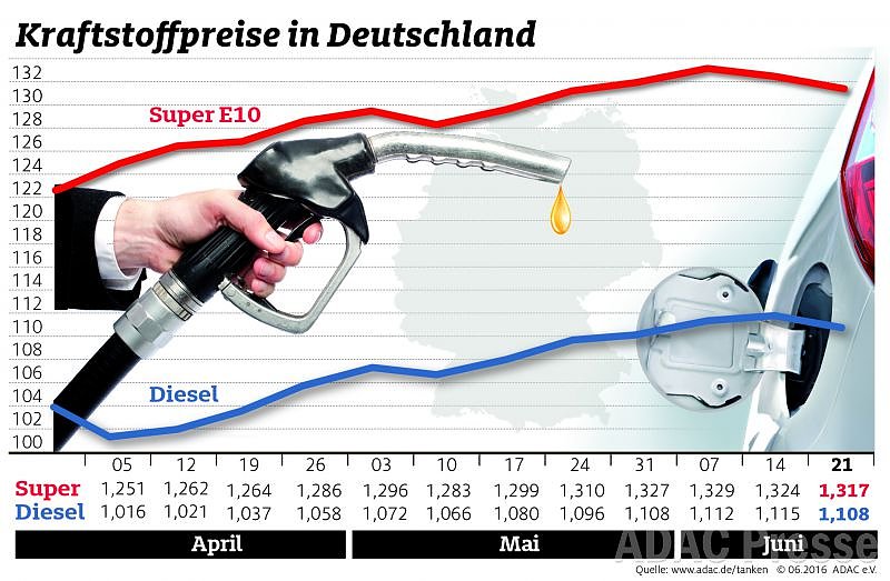 Super und Diesel sind in Deutschland im Vergleich zur Vorwoche etwas günstiger. Laut aktueller ADAC Auswertung der Kraftstoffpreise sind die Preise für beide Sorten um 0,7 Cent je Liter gesunken. Ein Liter Super E10 kostet demnach im Tagesmittel 1,317 Euro, ein Liter Diesel 1,108 Euro...