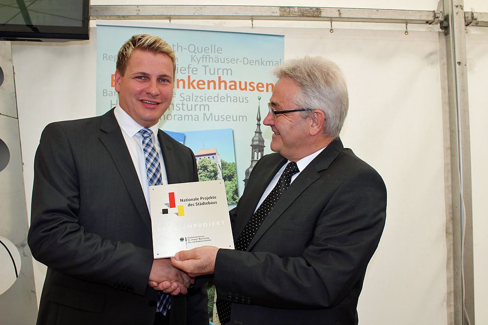 Professor Harald Herrmann, Direktor des Bundesinstituts für Bau- Stand- und Raumforschung im Bundesamt für Bauwesen und Raumordnung (re.) übergibt an Bürgermeister Strejc die Tafel der Premium-Plakette für die Realisierung des Bundesprojekts.