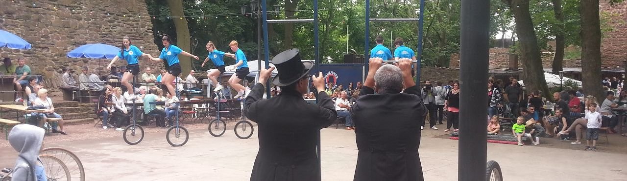 Wo immer sie auftreten, begeistern die Bornstedter Kunstradfahrer, wie hier am 12. Juni beim Heimatfest auf der Burg. (Foto: Jochen Miche)