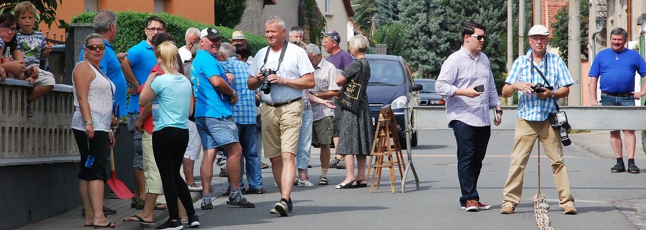 Eine weitere Herausforderung war selbstredend das Gewicht. Zwar wiegt ein einzelner Kronkorken nur 2,22 Gramm, insgesamt kamen da aber schon mal fast 260 Kilogramm zusammen, also mehr als fünf Zentner. Familie Elzner, auch Mitglied im Sportverein, nahm es sportlich mit der Aufgabe: Jede freie Minute wurde gefädelt. Heute funktionierten sie sogar ihren Hof zur Mess- und Maß-Zentrale um. Nun ja, das Messen übernahmen in der anliegenden Straße Neue Sorge Frank Mauder und Marco Kubo vom Ingenieurbüro Mauder in Eisleben, und das Maß (genauer: das halbe Maß, denn es gab nur Halbliterflaschen) nahmen die zahlreichen Zuschauer zu sich, die das ganze Spektakel verfolgten.