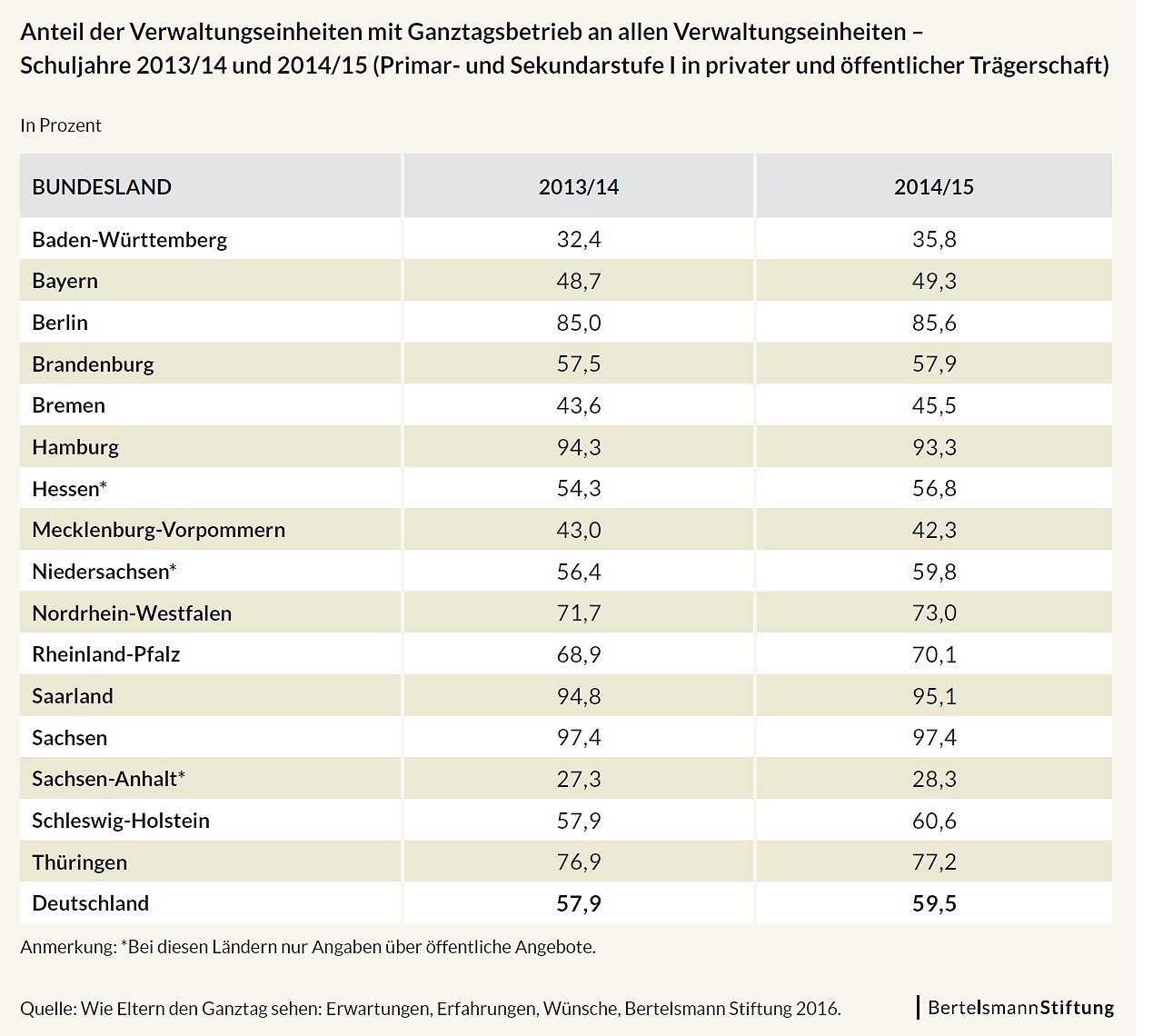 Das Ganztagsangebot wächst in Deutschland – deckt allerdings nicht den Bedarf. 35,8 Prozent aller Schüler hatten im Schuljahr 2013/2014 einen Ganztagsplatz. Im Schuljahr 2014/2015 waren es schon 37,7 Prozent. Zugleich sagen 30 Prozent der Eltern von Halbtagsschülern, sie würden sich heute für das ganztägige Lernen entscheiden. Das Angebot reicht jedoch nicht aus: 32 Prozent der Eltern von Kindern an Halbtagsschulen geben an, dass es in ihrer Nähe keine Ganztagsschule gibt.