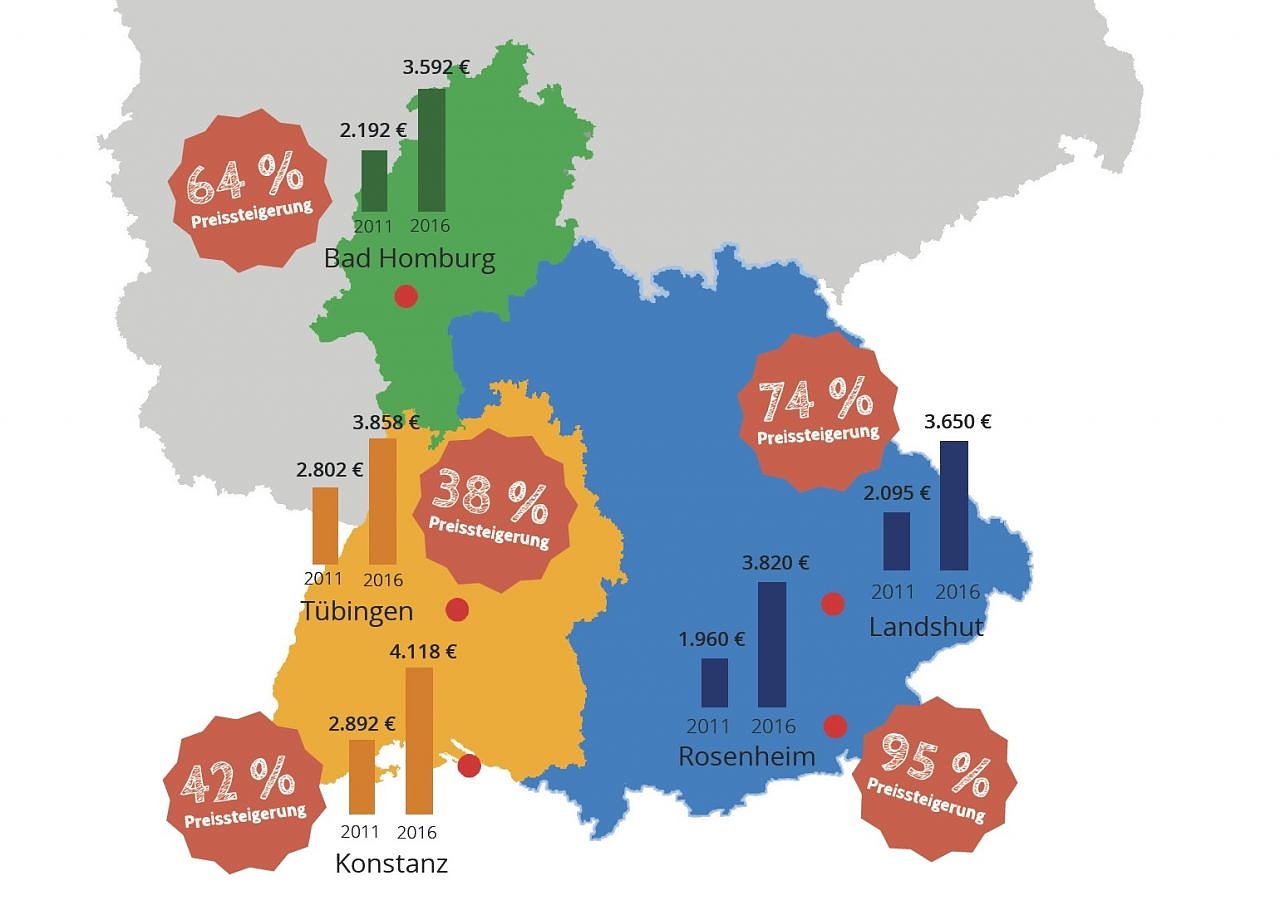 Untersucht wurden die Preise der insgesamt 107 deutschen Städte mit 50.000 bis 100.000 Einwohnern. Am teuersten sind Wohnungen und Häuser in den Mittelstädten Konstanz, Tübingen und Rosenheim. Auch in Landshut und Bad Homburg müssen Käufer tief in die Tasche greifen. Damit liegen 4 der 5 teuersten Mittelstädte in Süddeutschland.