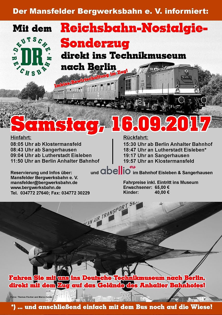 Der Verein hat für den 16. September 2017 einen Sonderzug im Reichsbahn-Nostalgie-Look organisiert. Dieser, bestehend aus einer Diesellok V 100 (neu 202) in Reichsbahnlackierung und drei Reisezugwagen aus den 70er und 80er Jahren, wird am 16. September von Klostermansfeld um 8.05 Uhr starten. Dann geht es über Sangerhausen und Eisleben, wo Zustiege ebenfalls möglich sind, ohne weitere Umstiege Richtung Berlin. Im Zug und auf der gesamten Fahrt muss niemand hungern oder dursten, denn ist eine Imbiss-Versorgung a la Mitropa sichergestellt. In Berlin endet der Zug 11.50 Uhr direkt im Deutschen Technikmuseum auf dem Gelände des ehemaligen Anhalter Bahnhofes.