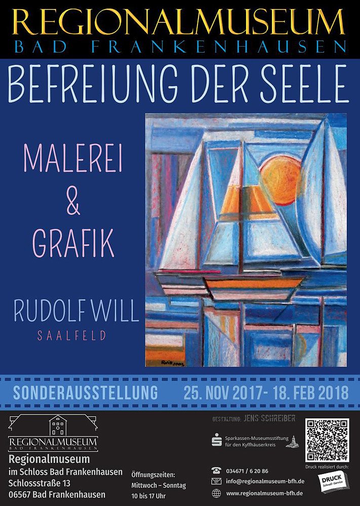 Ab dem 25. November 2017 gibt es im Regionalmuseum Bad Frankenhausen eine neue Sonderausstellung zu sehen. Rudolf Will aus Saalfeld zeigt in seiner Ausstellung Befreiung der Seele Malerei und grafische Werke aus seinem künstlerischen Schaffen. Mit der Region am Kyffhäuser verbindet ihn seine Kinder- und Jugendzeit.