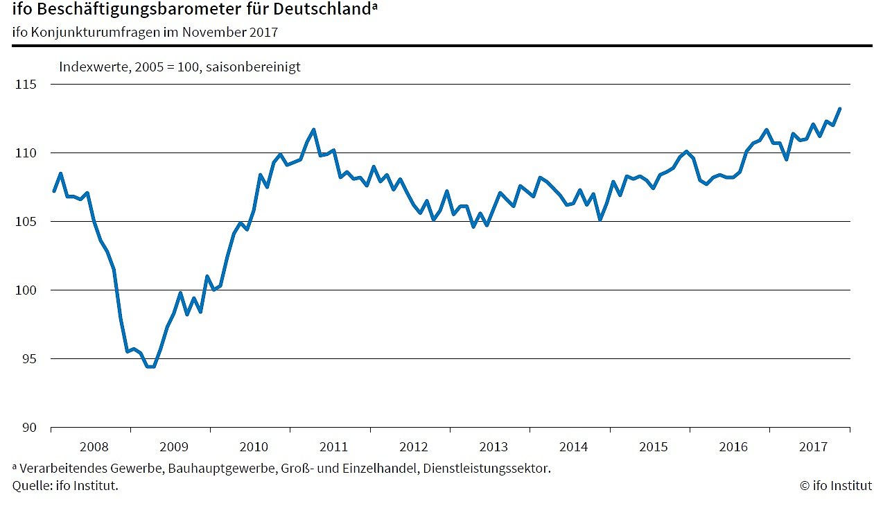 Die deutschen Unternehmen suchen händeringend nach neuen Mitarbeitern. Das ifo Beschäftigungsbarometer stieg von 112,0 Punkten im Oktober auf 113,2 Punkte im November. Dies ist der höchste jemals gemessene Wert...