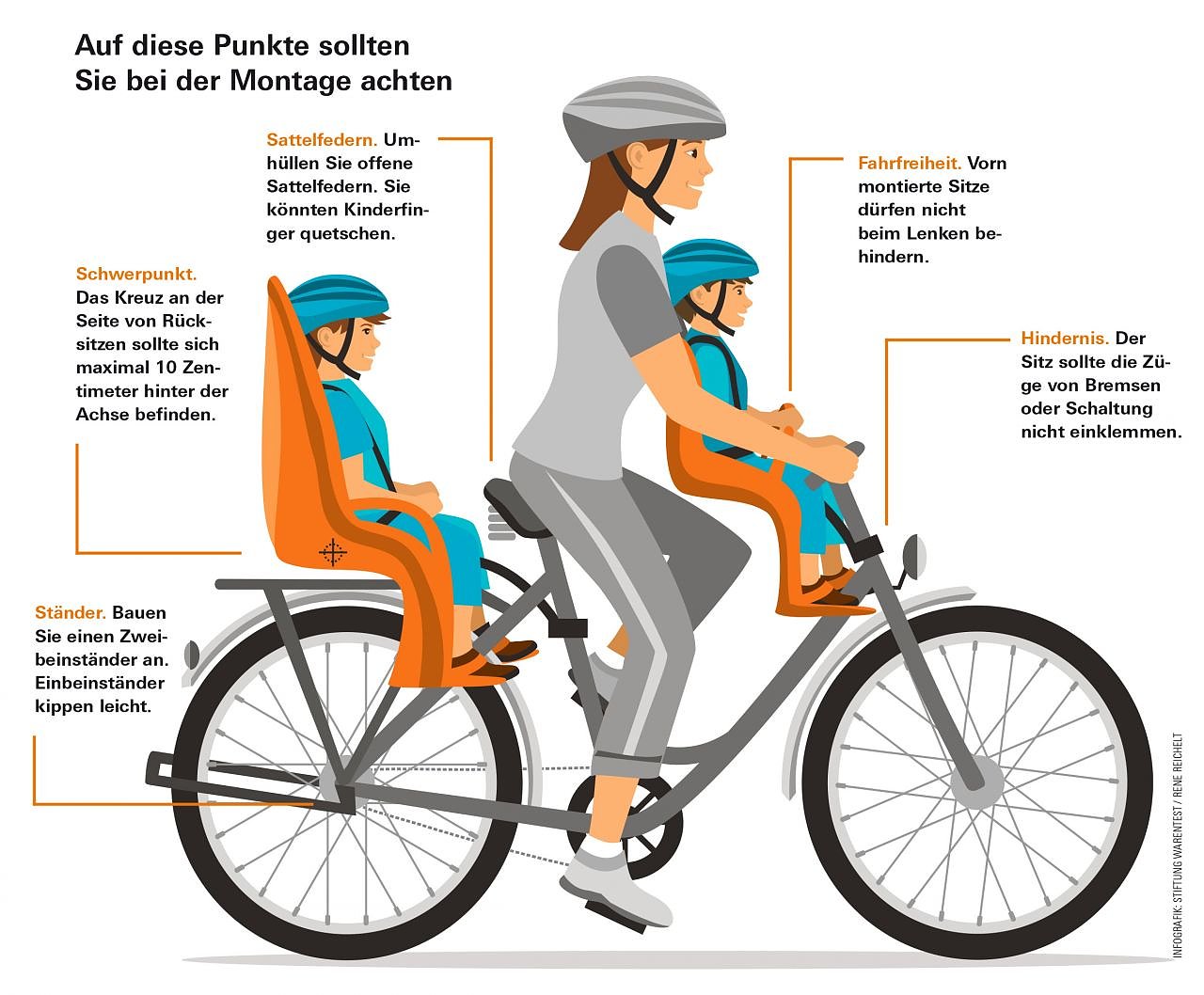 Im Test waren 5 Sitze zur Montage vor dem Fahrer für Kinder bis 15 Kilogramm und 12 zur Montage am Sitzrohr hinter dem Fahrer für Kinder bis 22 kg. Für beide Gruppen gibt es gute Sitze ab 60 bzw. 65 Euro. Die Stiftung rät, Fahrradkindersitze beim Fachhändler zu kaufen, denn dieser kann beurteilen, welcher Sitz zum Rad passt, und ihn montieren.