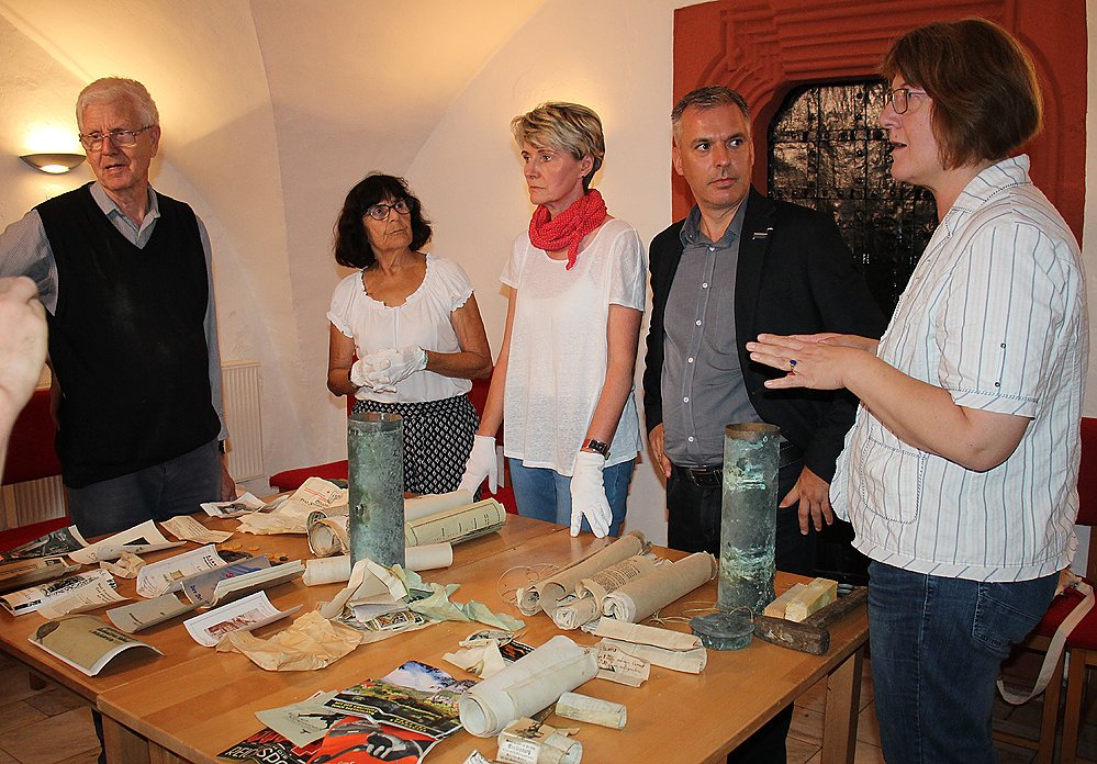 Die erste geöffnete Hülse enthielt Dokumente die bis ins 15. Jahrhundert zurückreichen. Neben Dokumenten wurden einzelnen Münzen und aus neuerer Zeit Notgeldscheinen aus der Zeit nach dem 1. Weltkrieg gefundenn.