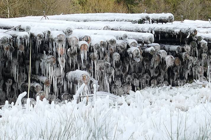 Mit den ersten Nachtfrösten an der Okertalsperre und im Tal der Innerste hat sich ein Eispanzer über die Fichtenstämme gelegt. Die Beregnungsanlage wurden abgeschaltet und die niedrigen Temperaturen bieten jetzt einen natürlichen Schutz vor dem Verderben des Holzes.